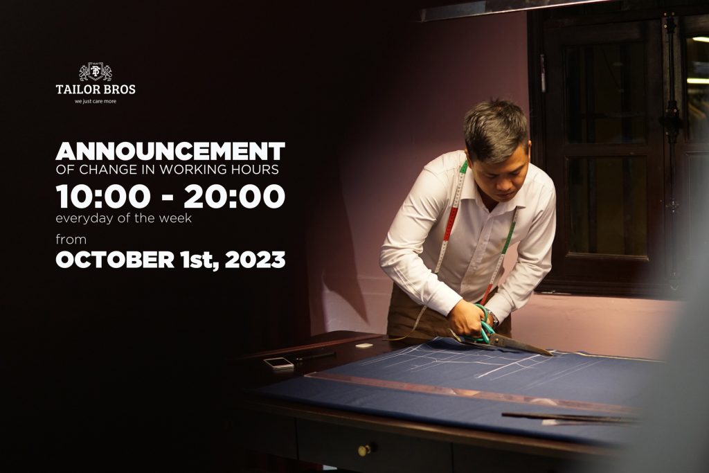 We would like to announce that from October 1, 2023, Tailor Bros will change its working hours as follows: