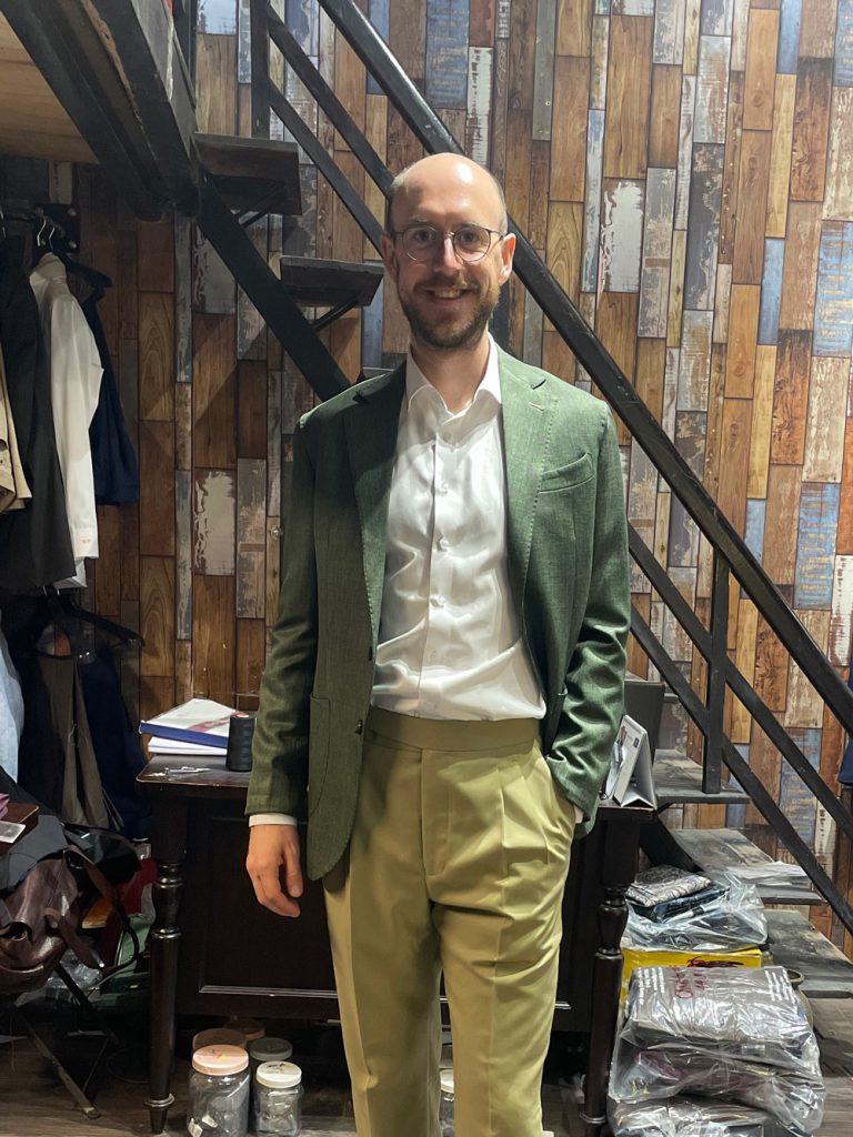 Home » Gallery » A green jacket paired with beige trousers – a fresh, nature-inspired combination perfect for summer