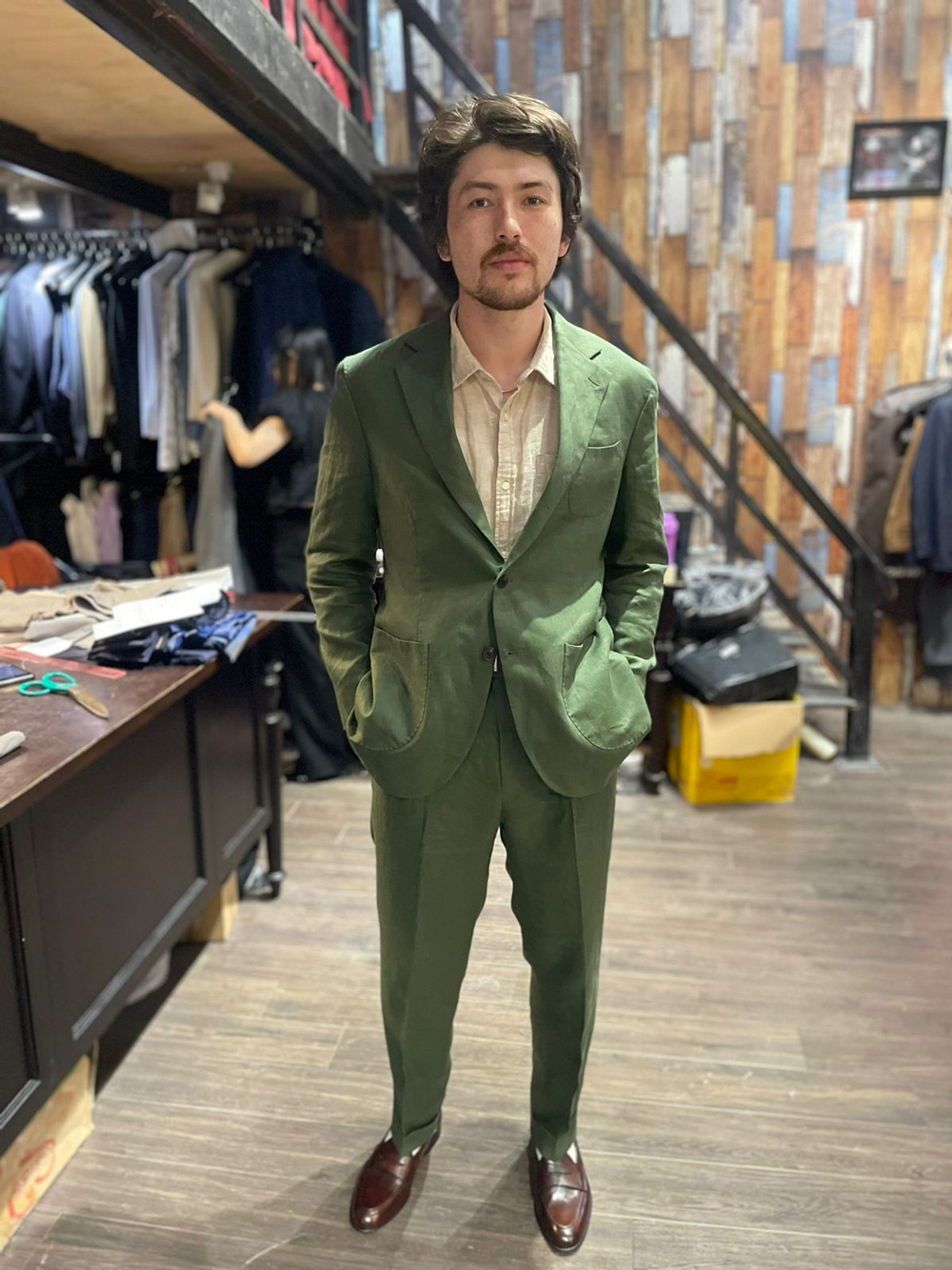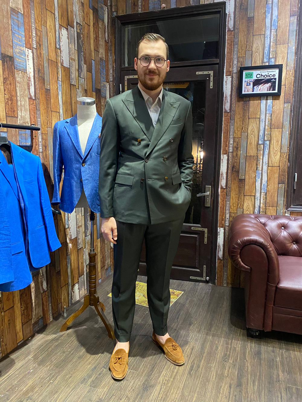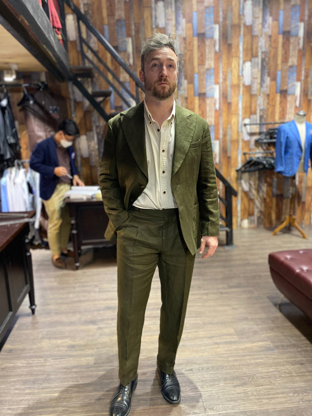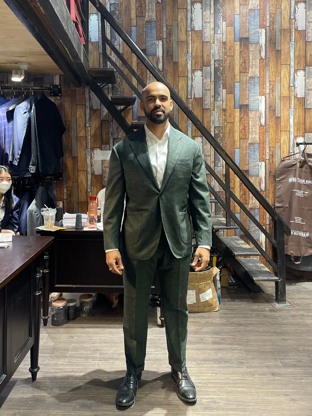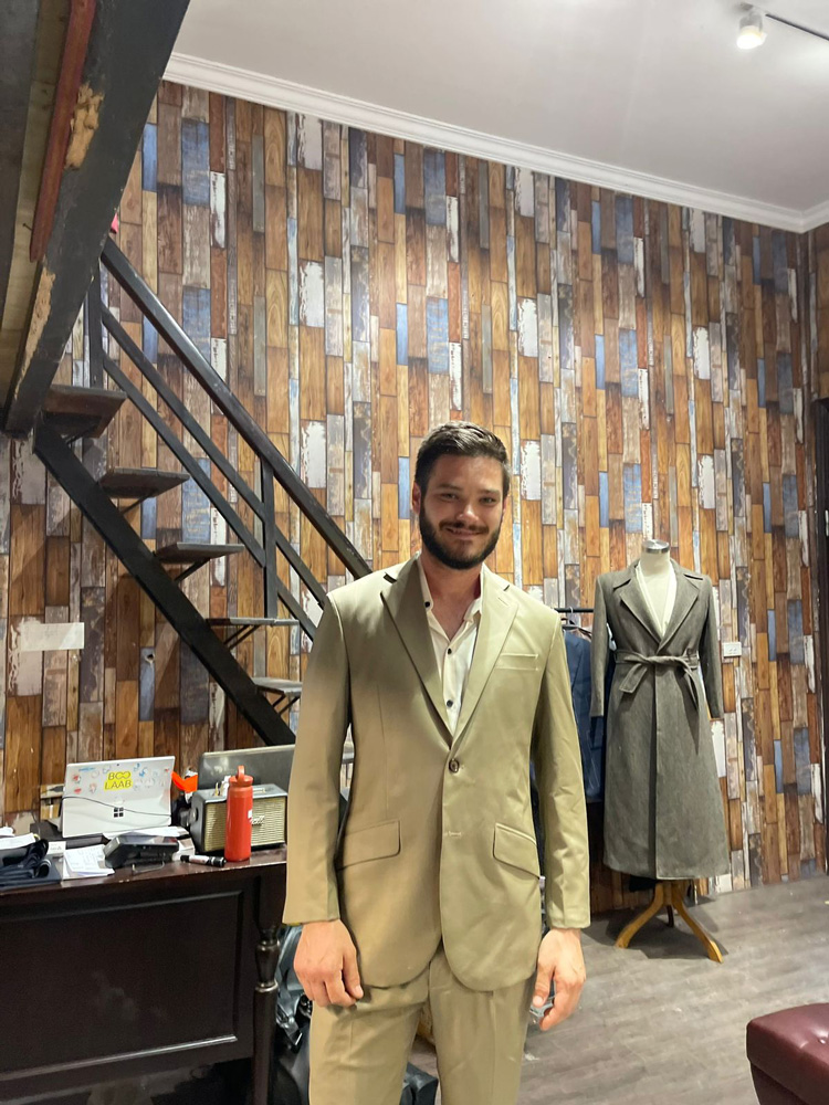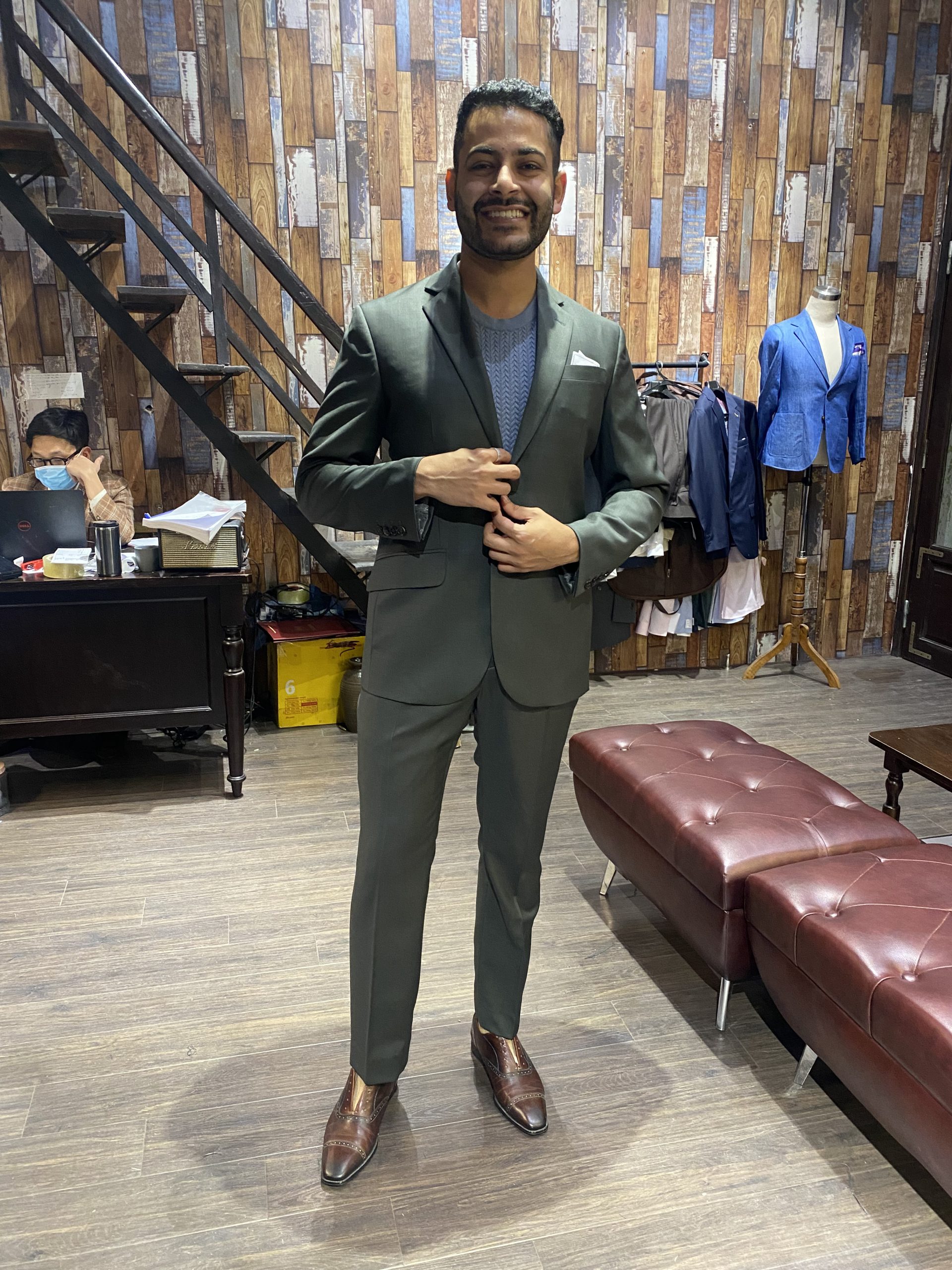 A customer from the UK in an olive-gray suit