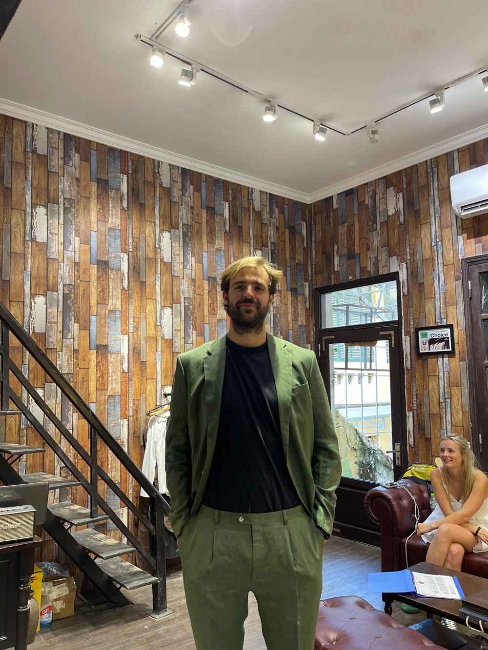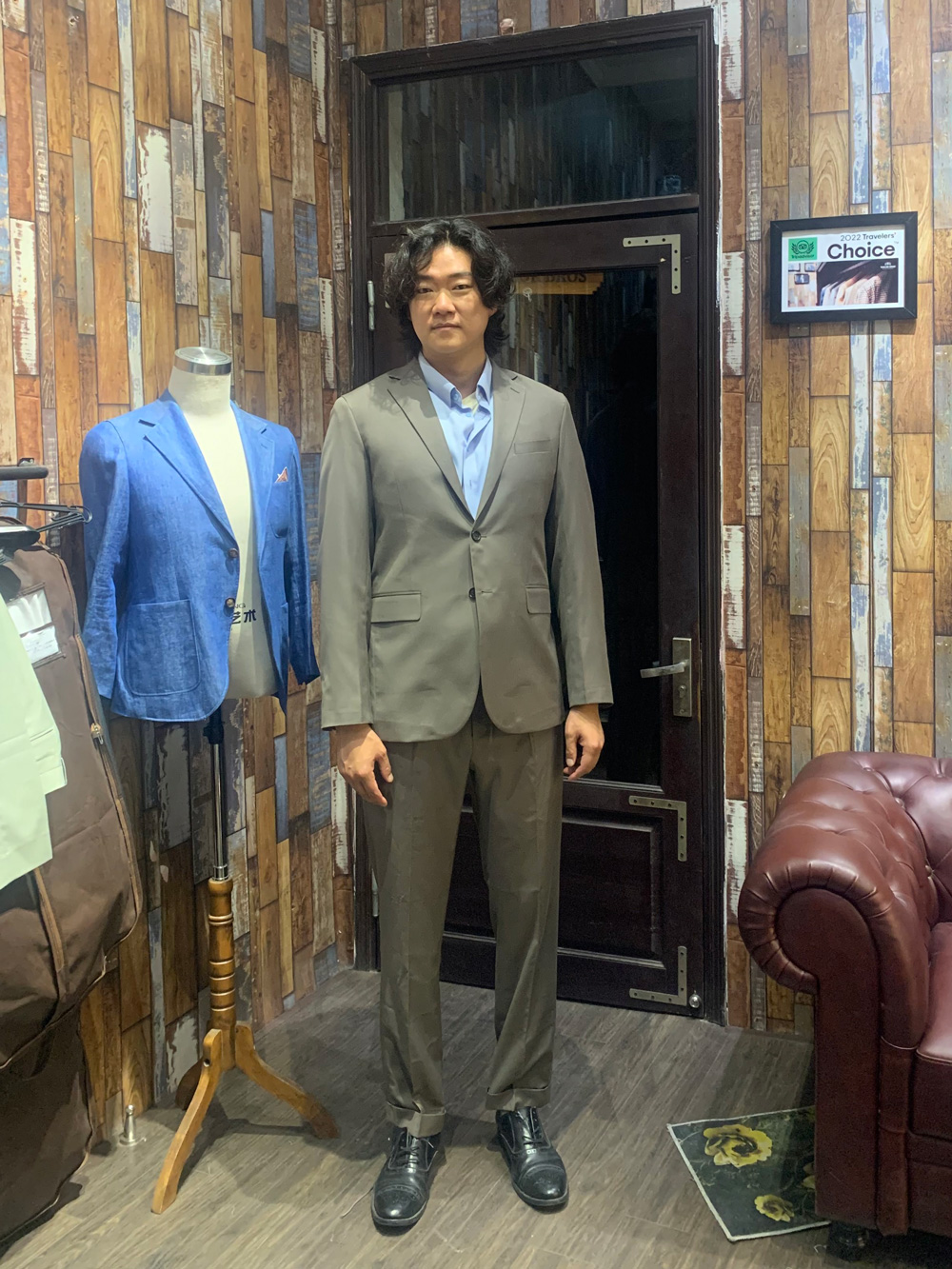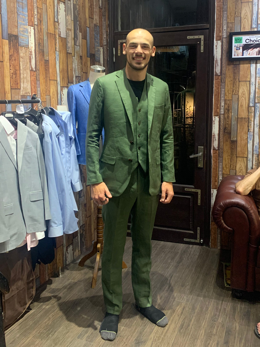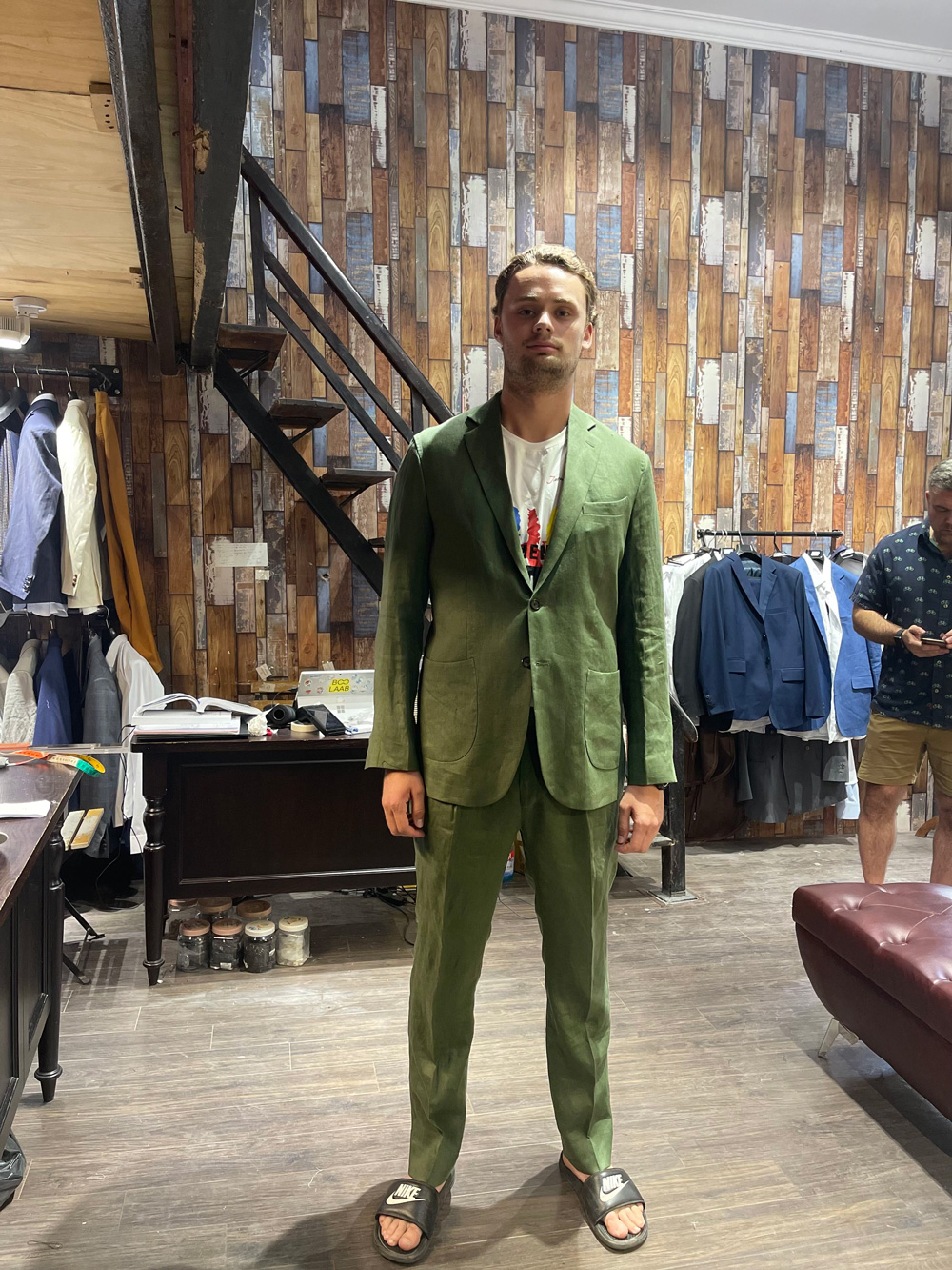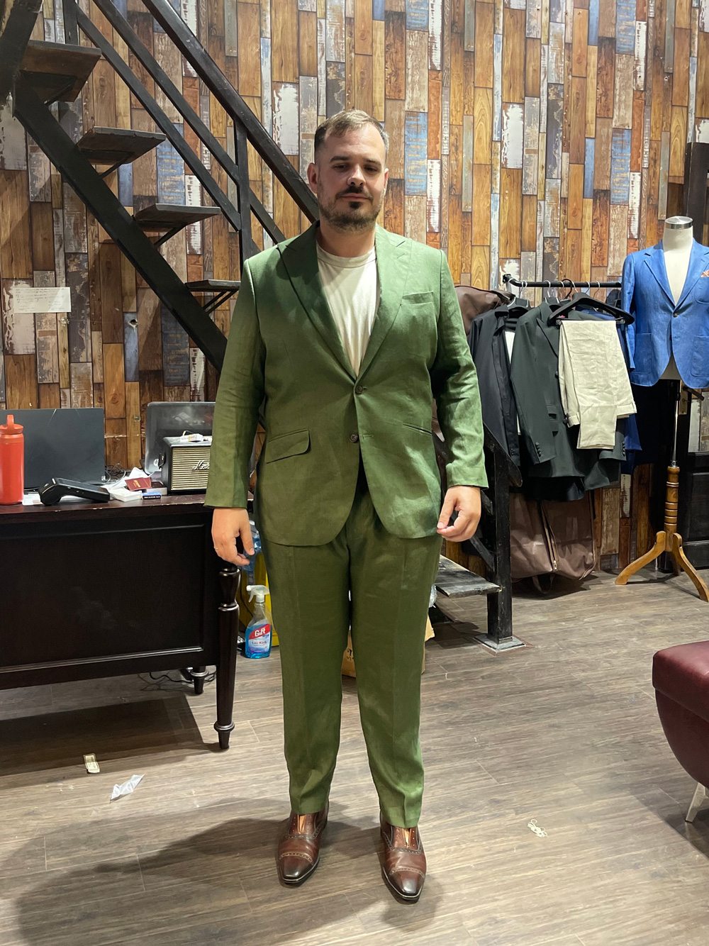 A customer from the UK in an olive-gray suit