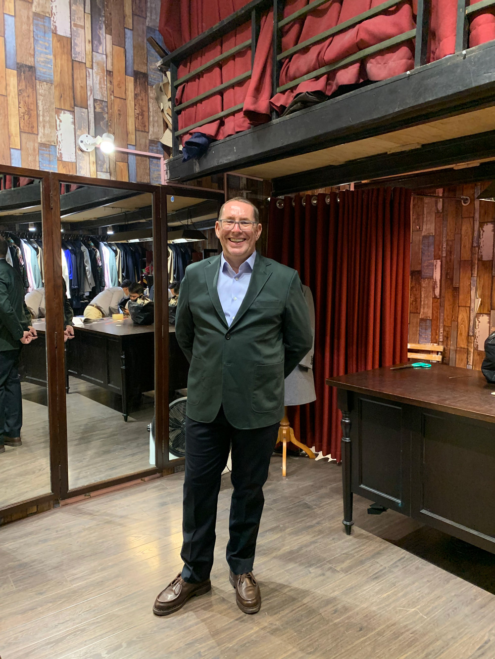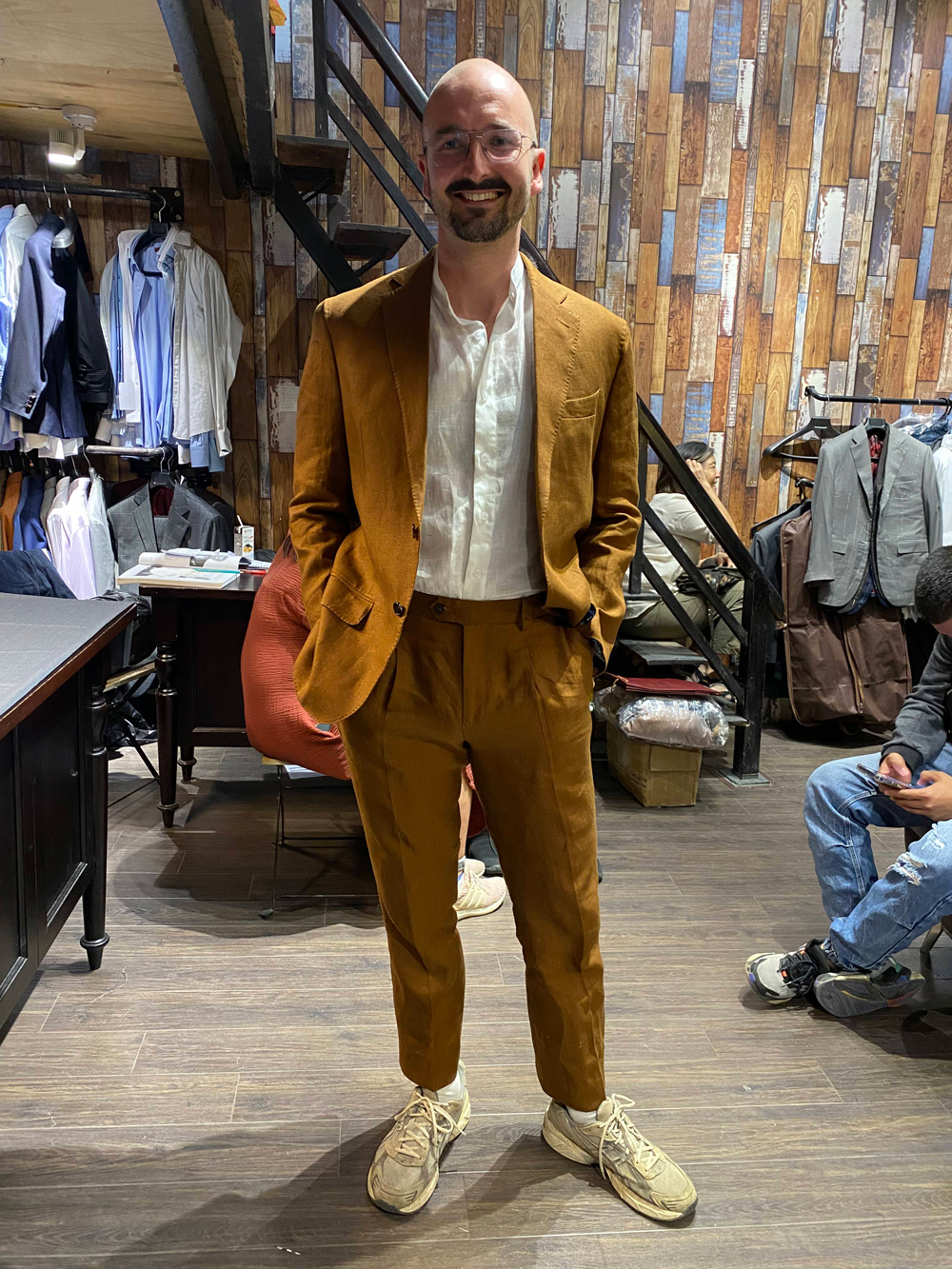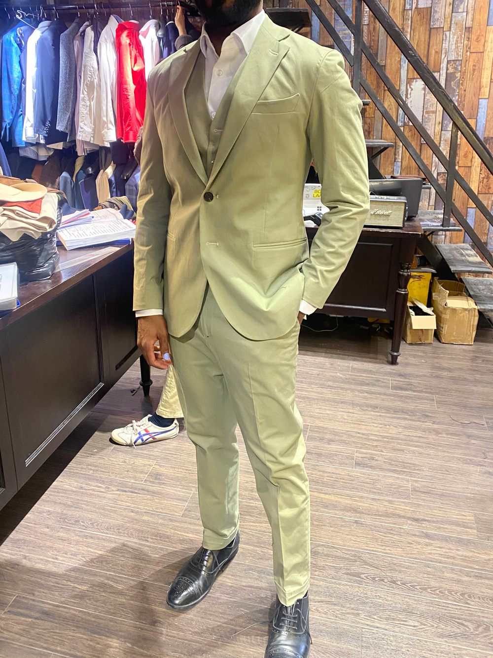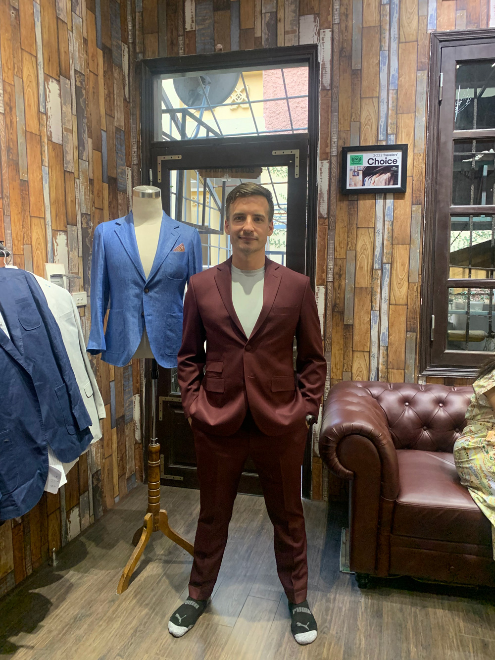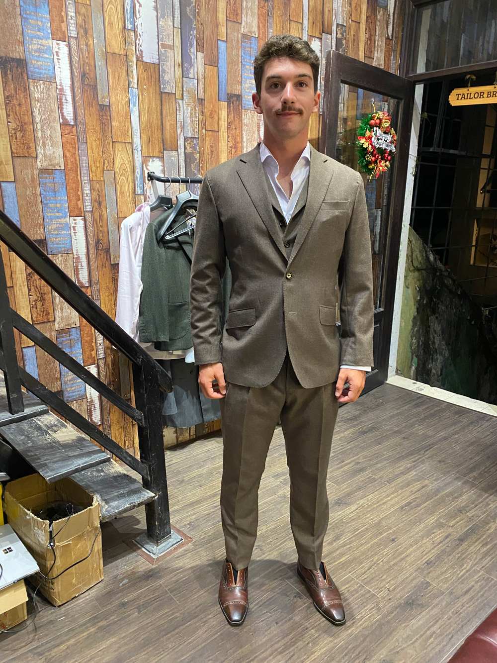 A customer from the UK in an olive-gray suit