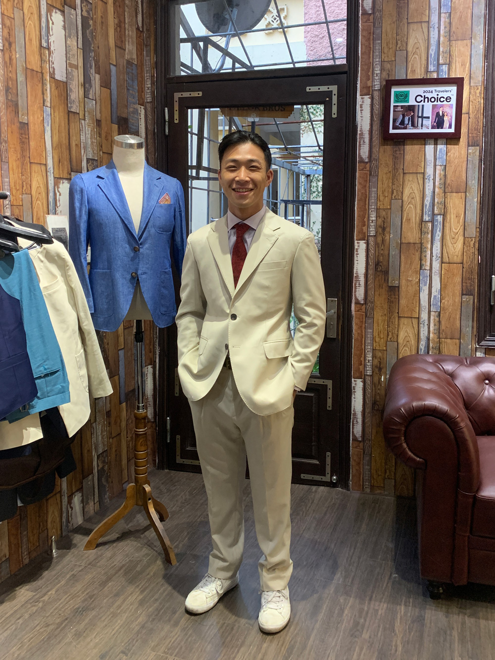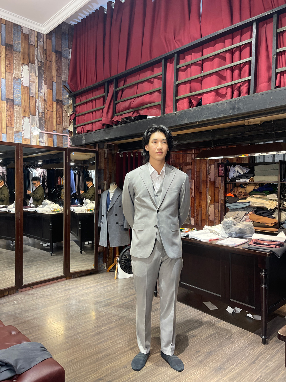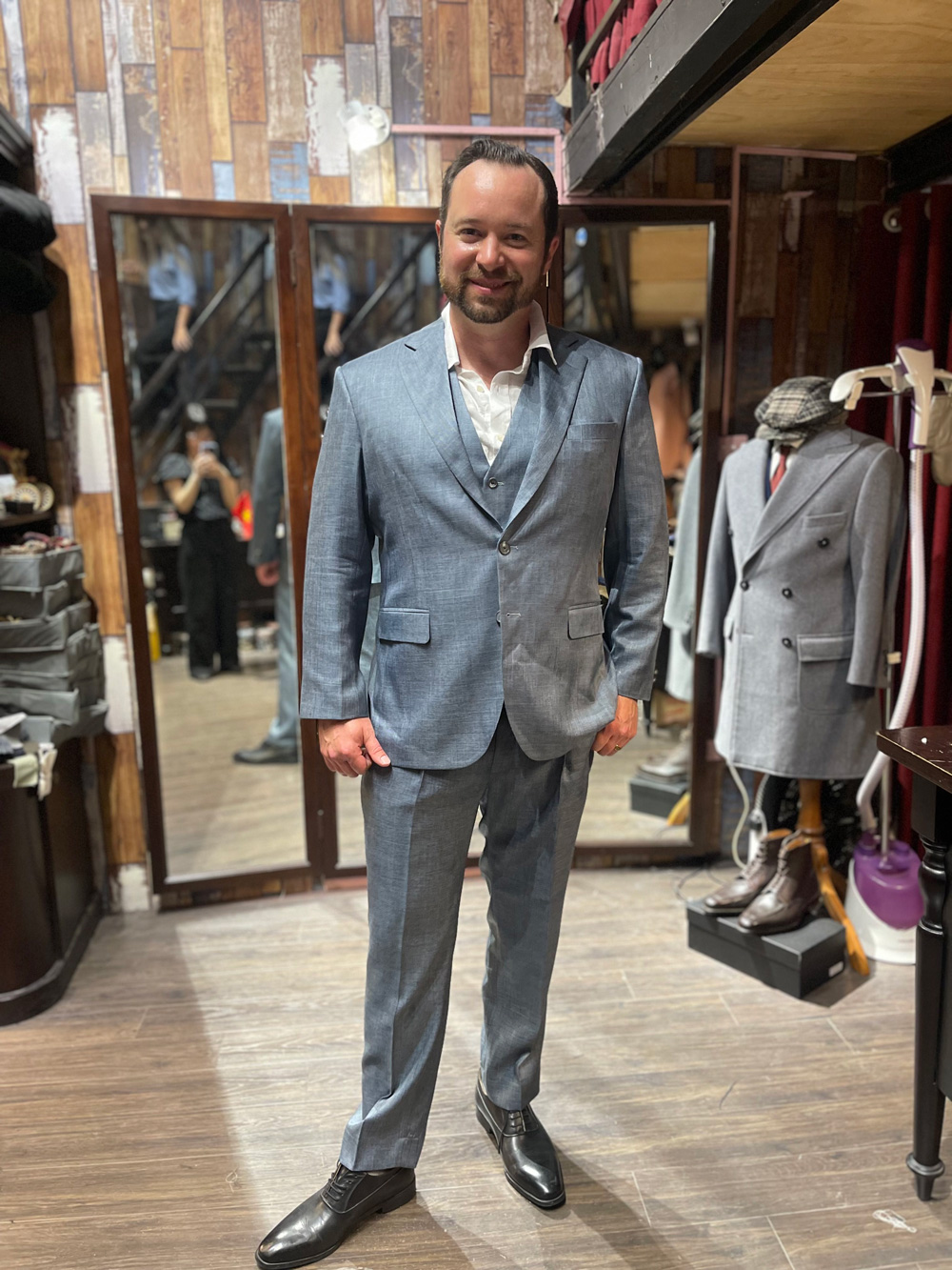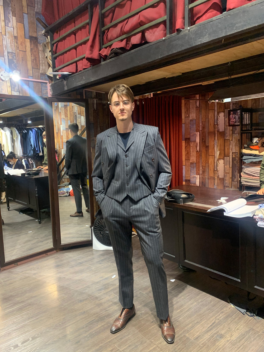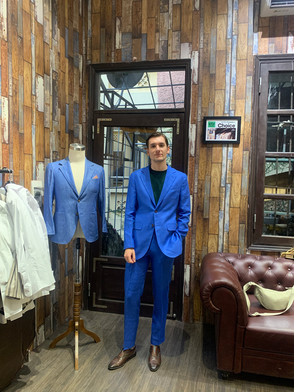 You think this gentleman came to Hanoi to have these suits tailored with all the measuring, fitting and stuff, then took it home? No, he ordered our remote tailoring service