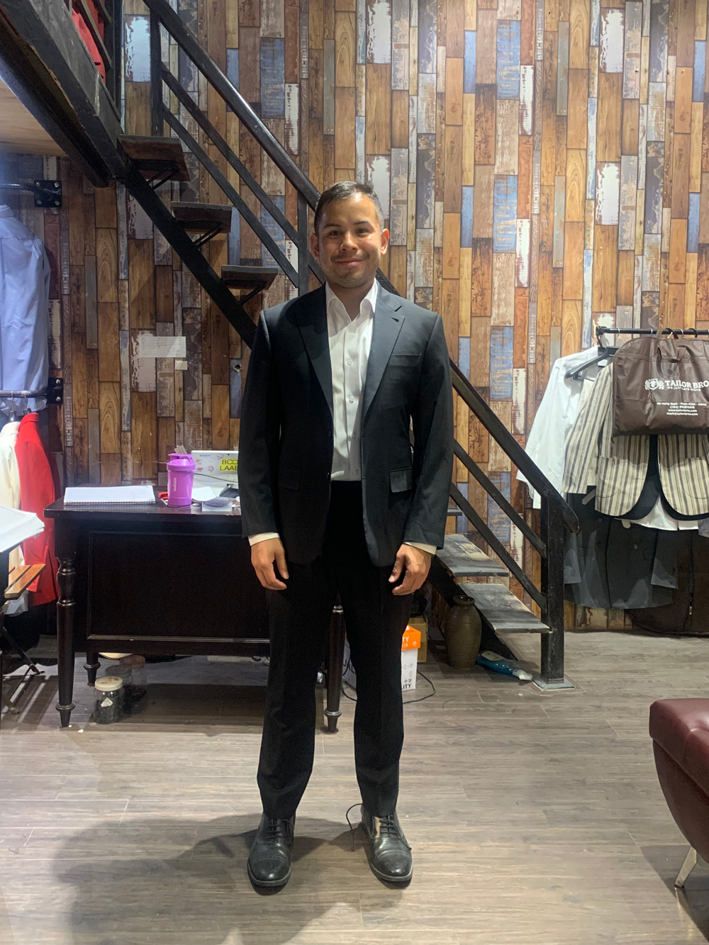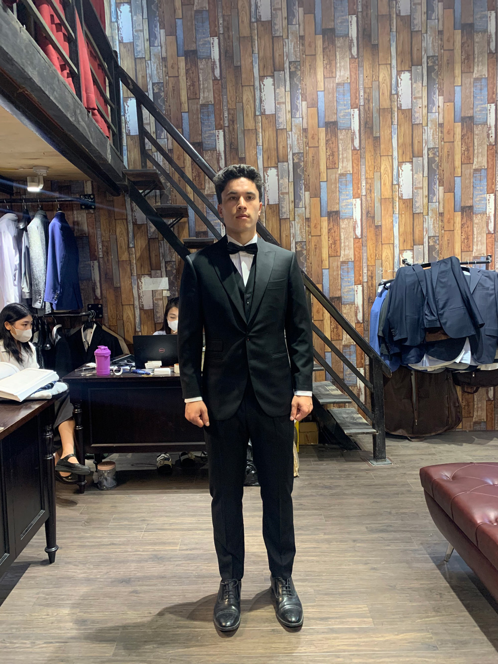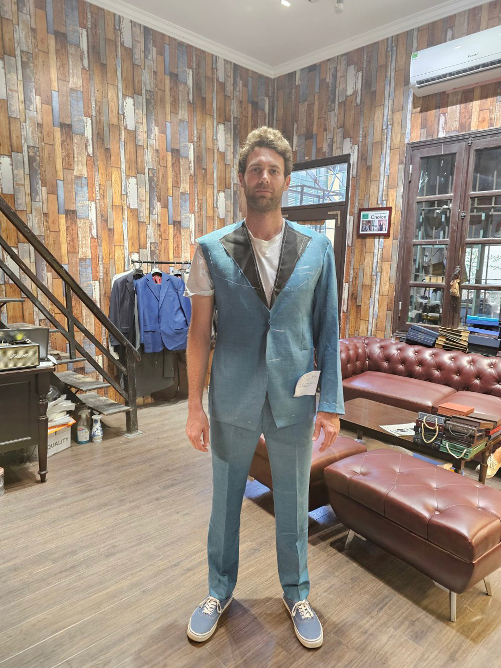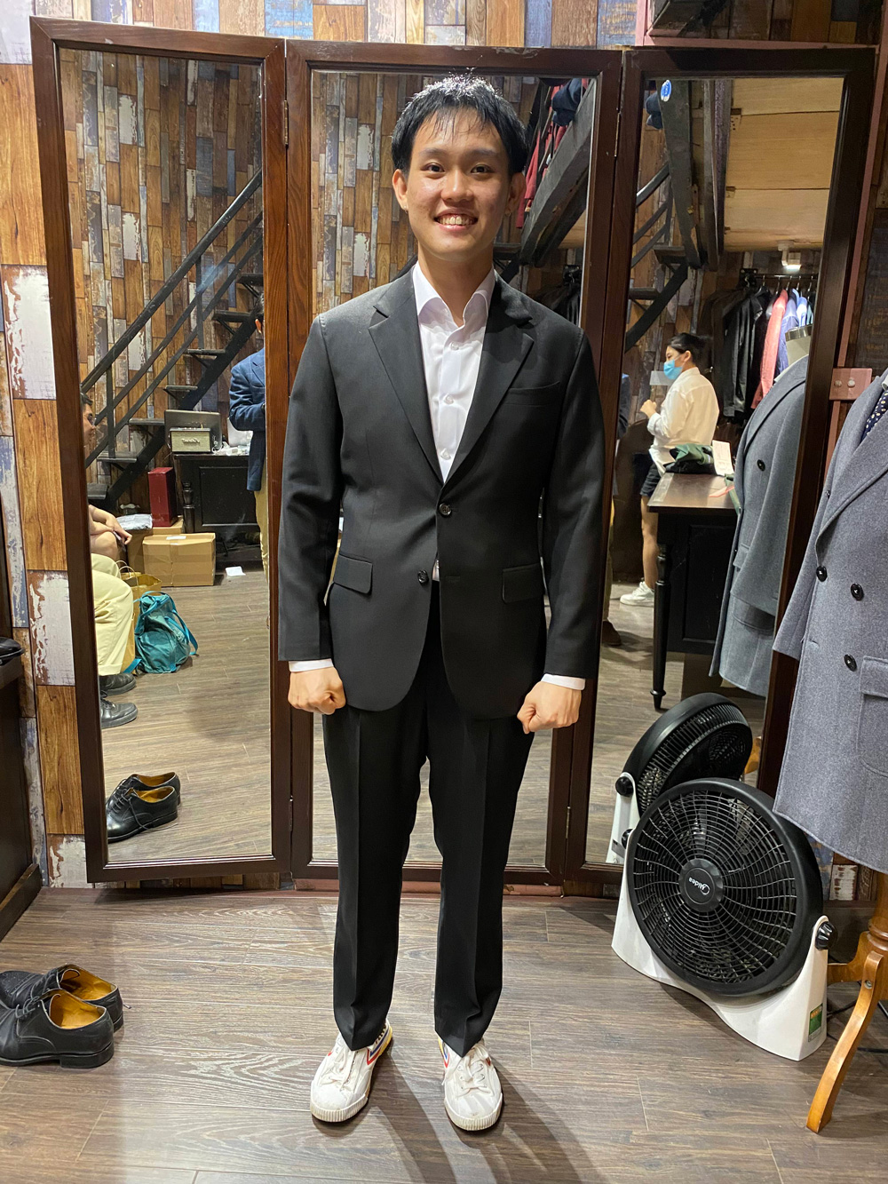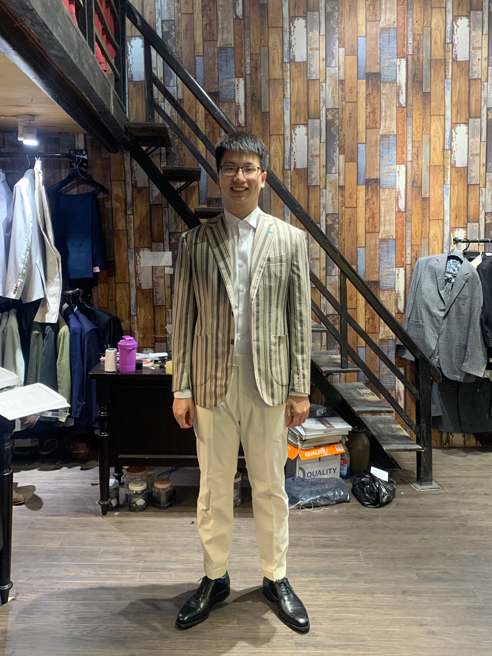 You think this gentleman came to Hanoi to have these suits tailored with all the measuring, fitting and stuff, then took it home? No, he ordered our remote tailoring service