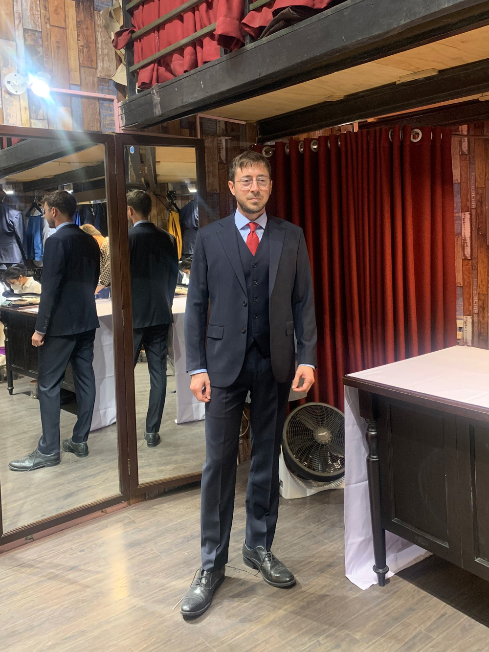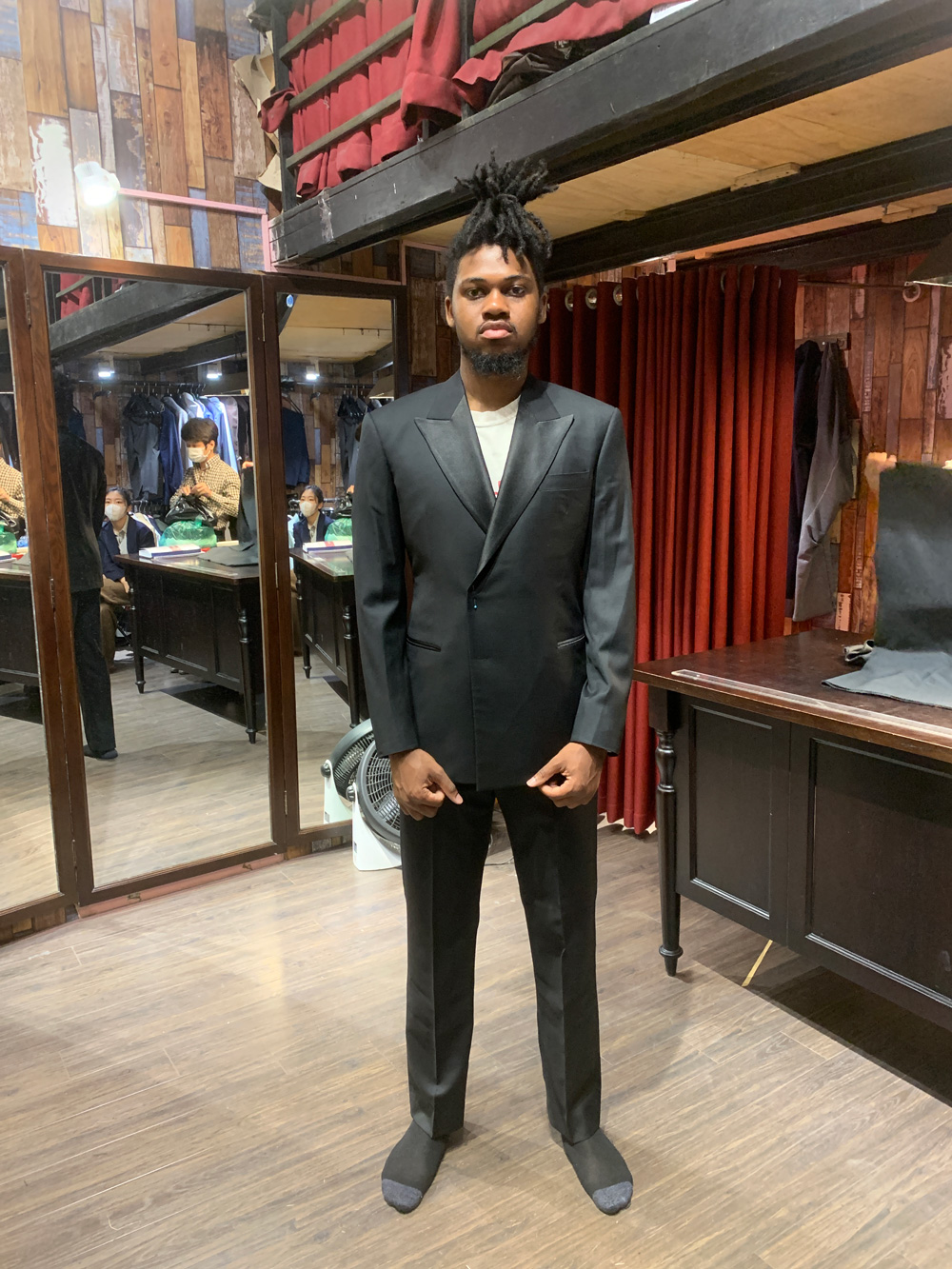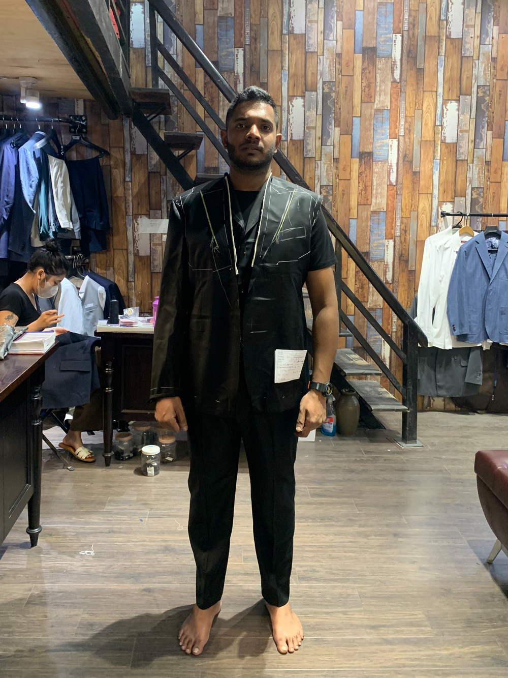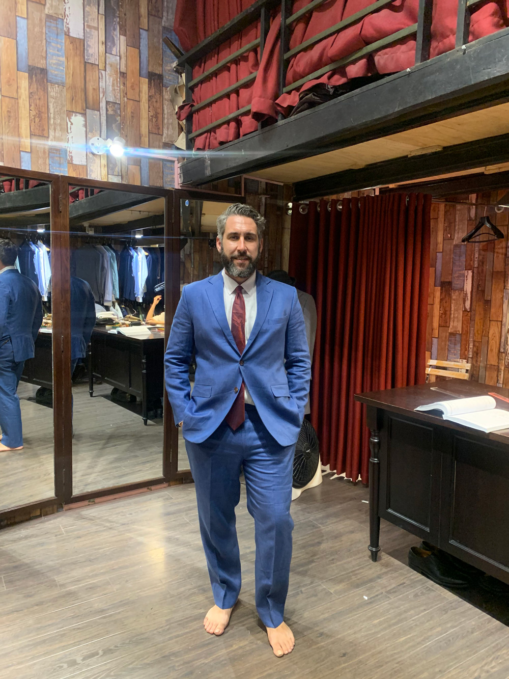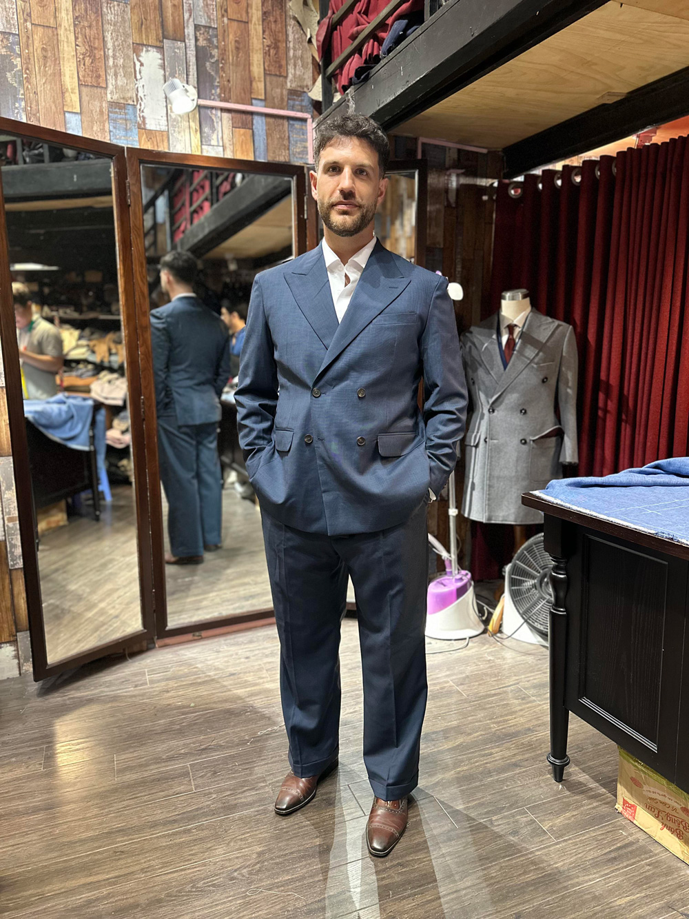 You think this gentleman came to Hanoi to have these suits tailored with all the measuring, fitting and stuff, then took it home? No, he ordered our remote tailoring service