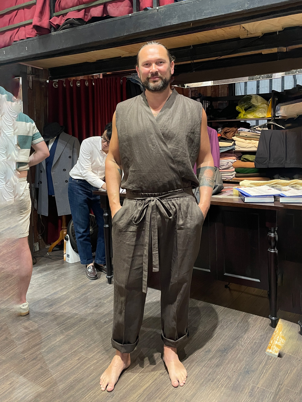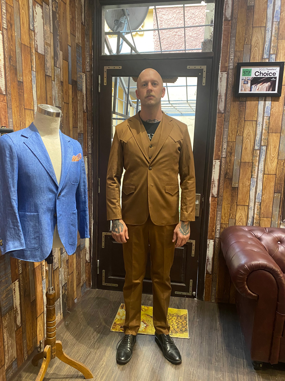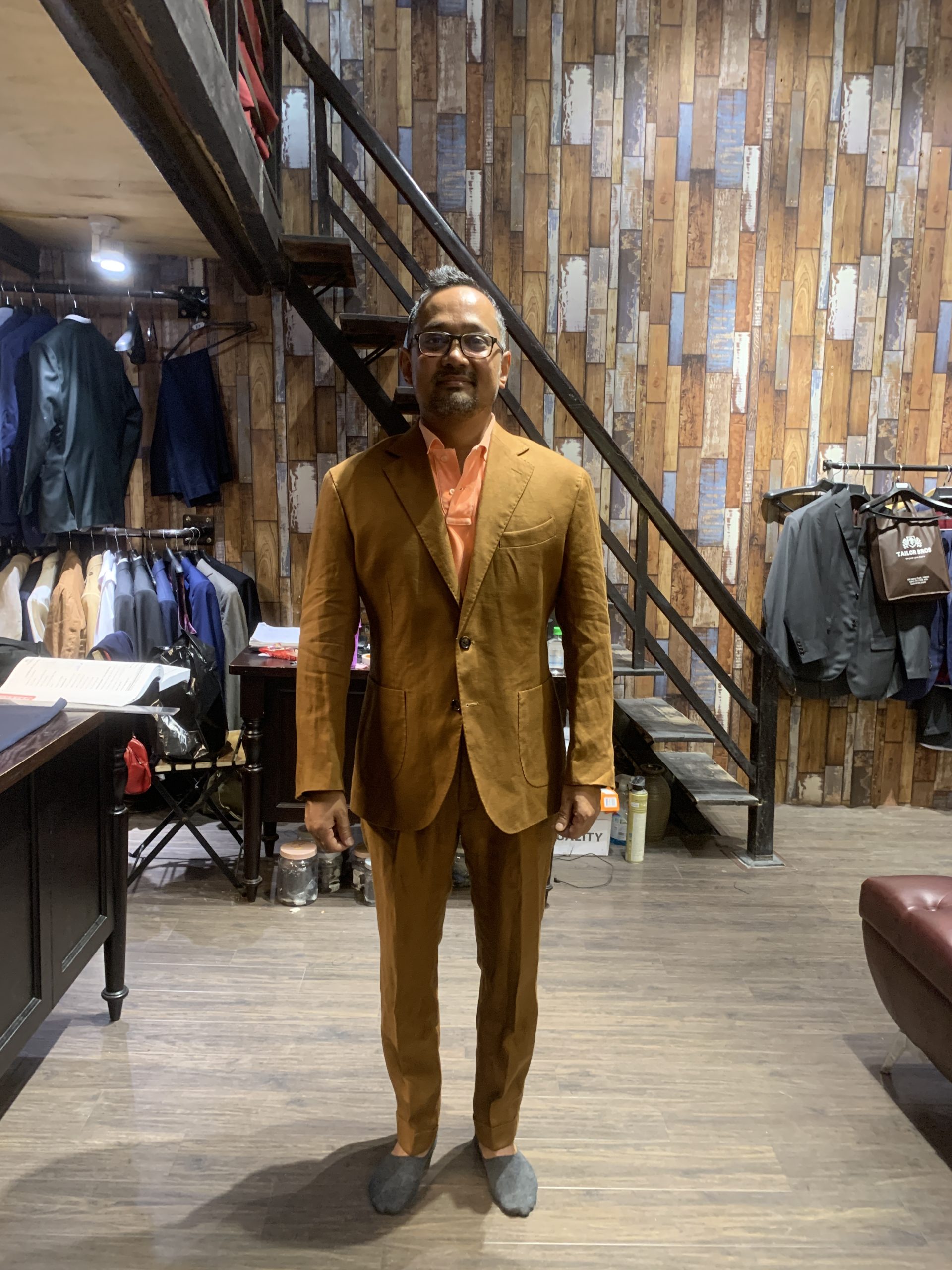 Our customer in a 3-piece beige cotton suit