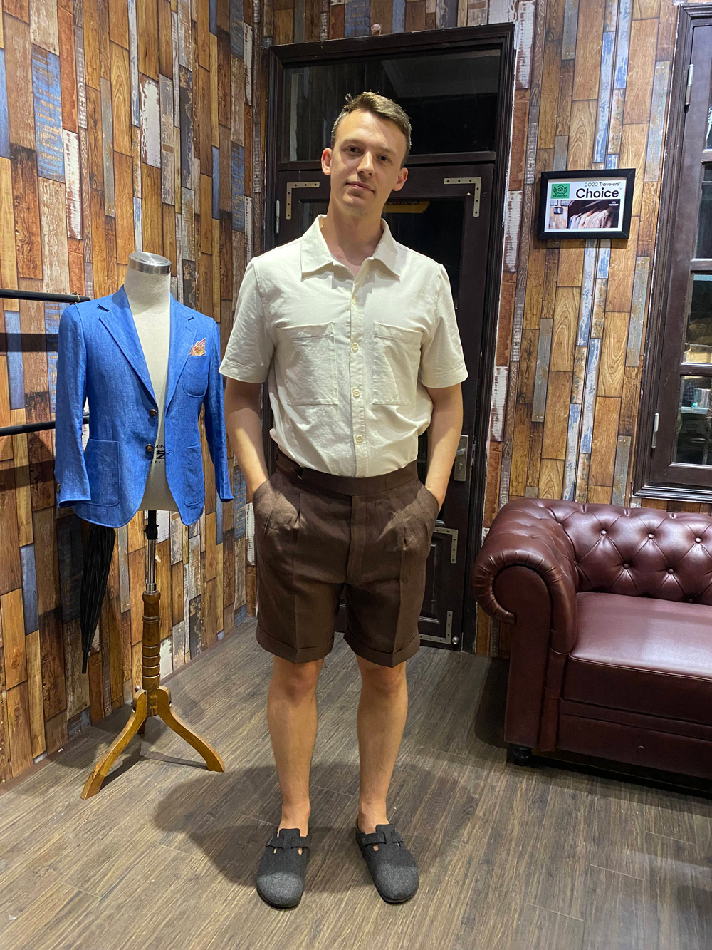 This guy chose a suit and shorts made of brown linen – a fabric that is very easy to wear in the summer