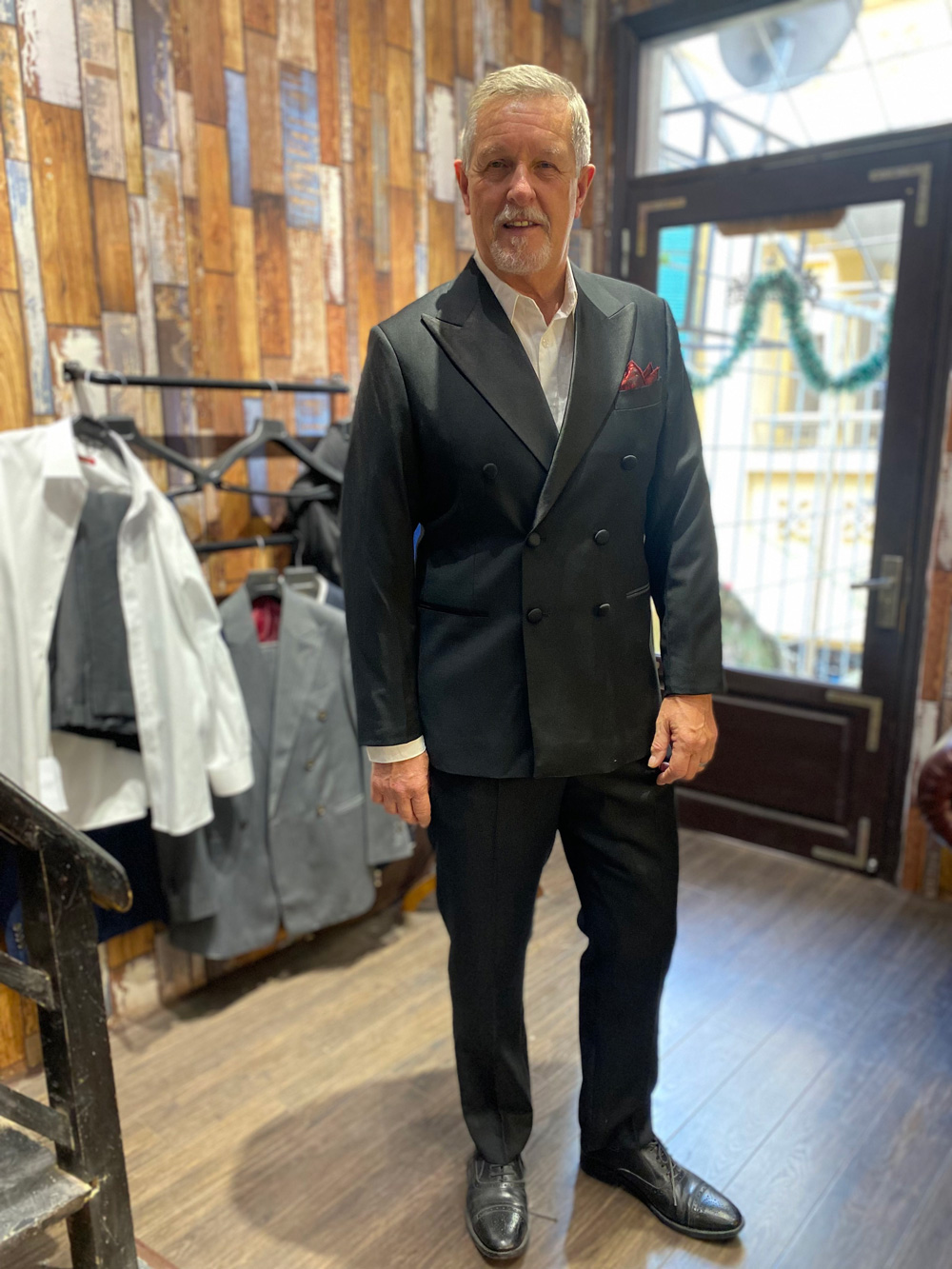 A dapper gentleman in our double-breasted tux. A testament to the old saying: “Aging like fine wine”