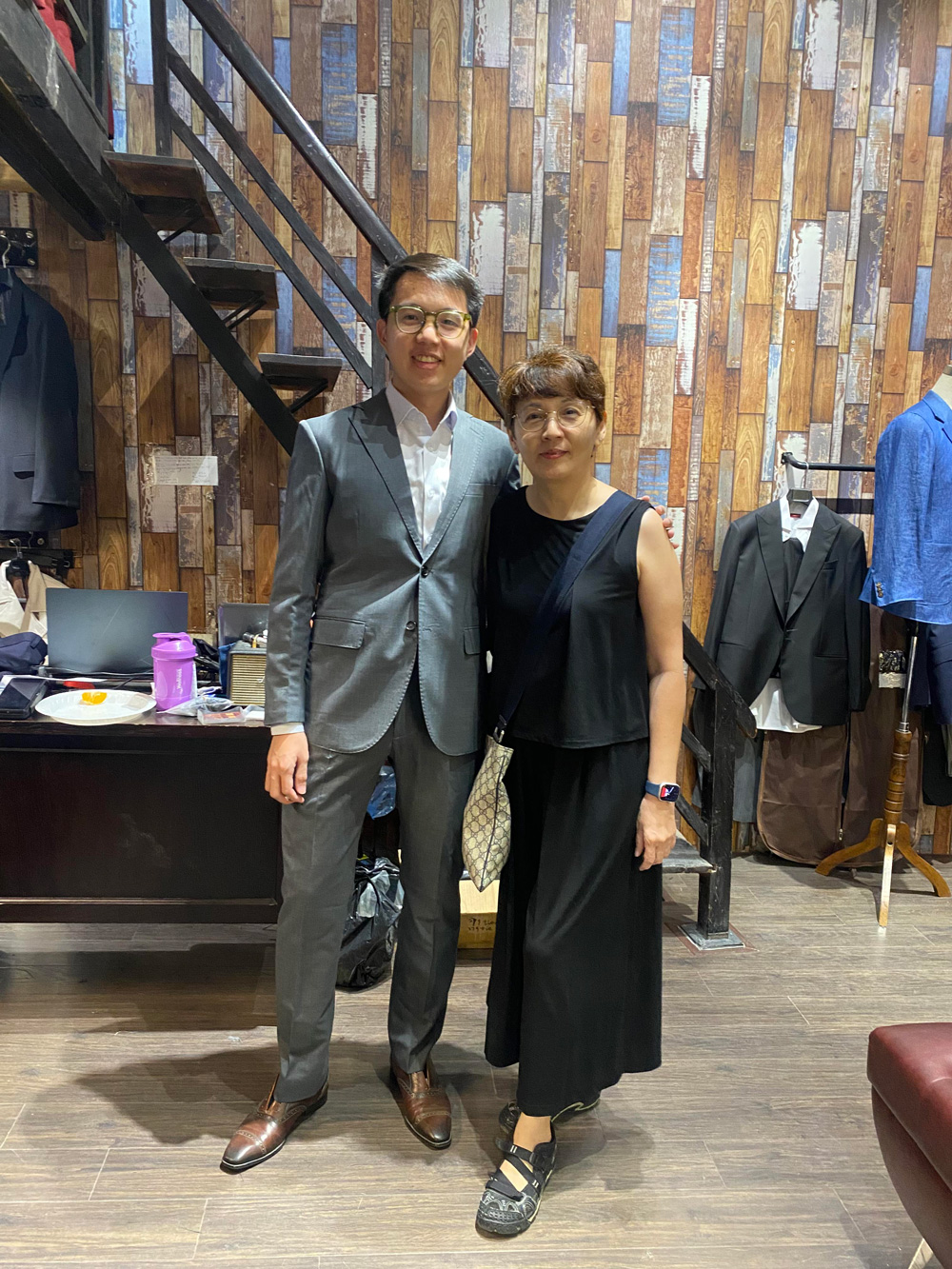 Our client mother and son in two basic color suits: navy and grey